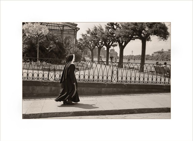 A nun in a hurry somewhere, heading toward the Arno, Florence, 1958