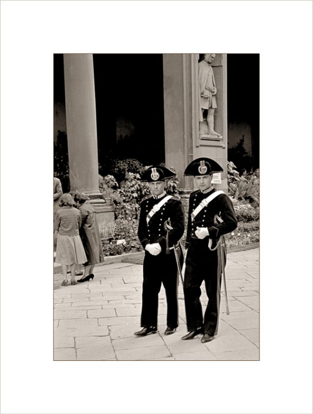 A pair of carabinieri (military police) patrol near the Uffizi gallery, Florence, 1958