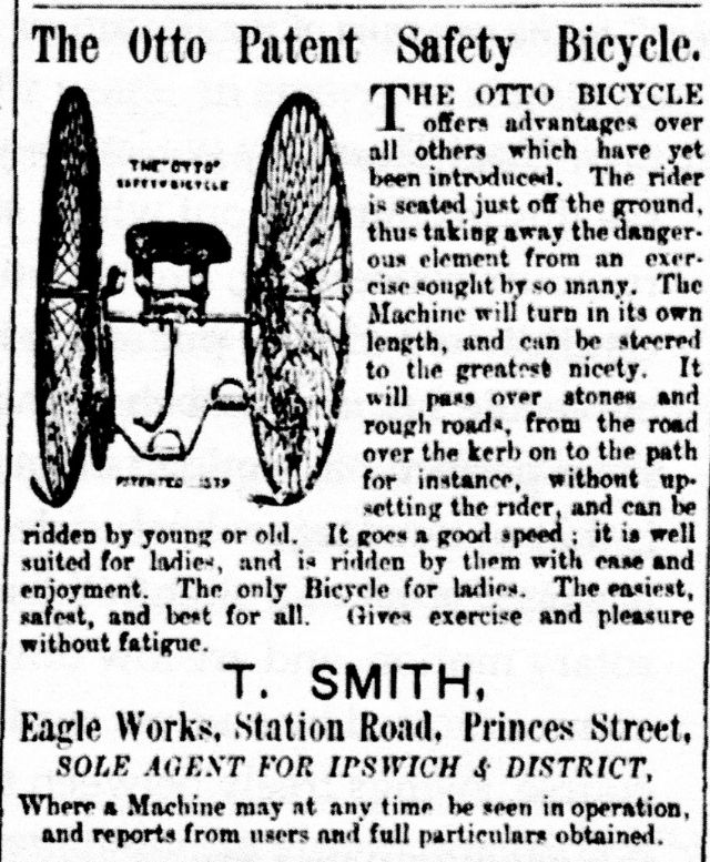 According to research by Andrew Pattle and Wayne Mann, in their excellent booklet “Mr Otto’s Bicycle”, Birmingham Small Arms Company (BSA) built 953 Ottos between 1880 and 1883. It was subsequently called a ‘Dicycle’ as it was not a tricycle but, despite only having two wheels, was not exactly a bicycle.