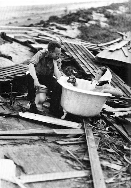 | Kate Hepburn sitting in a tub after the Great New England Hurricane of 1938. |