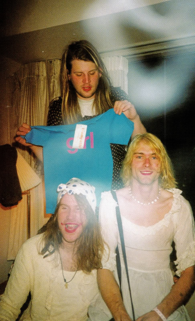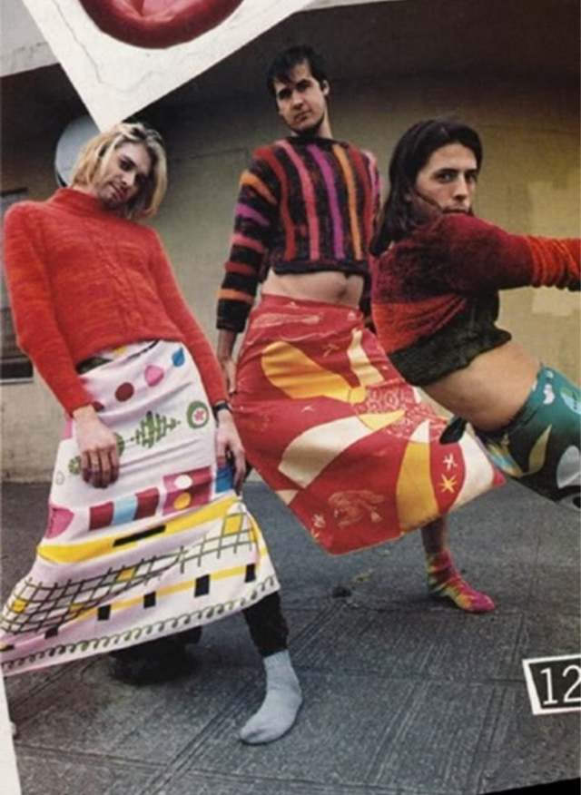In 1991 Kurt Cobain wore a vintage canary-yellow ball gown on MTV’s popular heavy metal program Headbangers Ball. He also wore a dress in several scenes of Nirvana’s music video for “In Bloom.” In January 1993, Cobain performed in Rio de Janeiro in a tiara and a black slip-on dress. Later that year Cobain, alongside bandmates Dave Grohl and Krist Novoselic, also posed in a dress for the November issue of Mademoiselle Magazine.