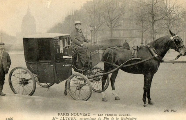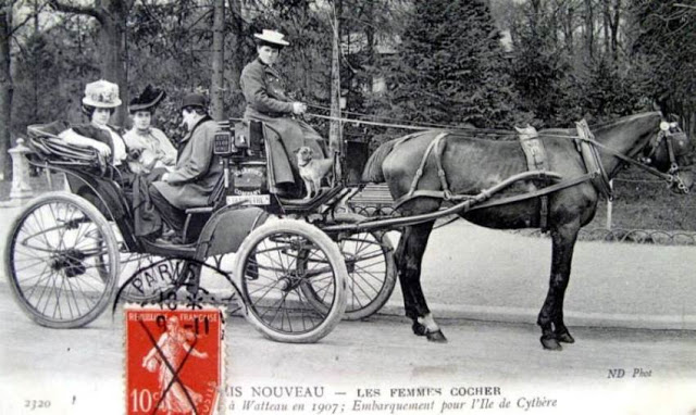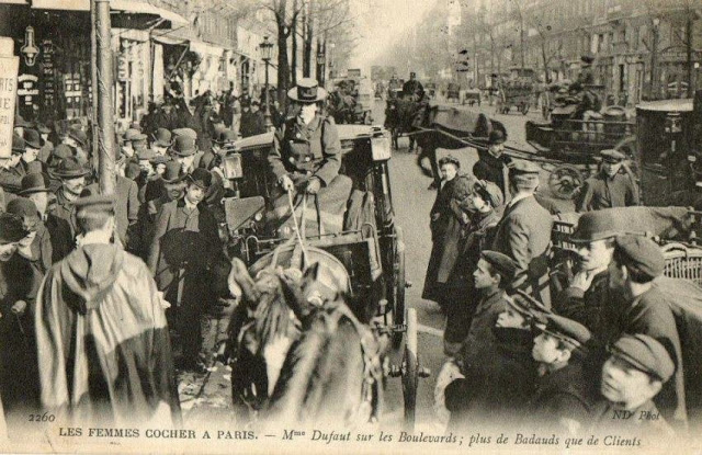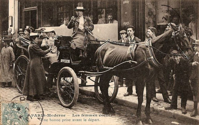 In November, 1906, three women began a month-long apprenticeship in preparation for the Prefecture of Police examination that would qualify them to drive horse cabs in Paris. Several other women were accepted into the apprenticeship program soon afterward.