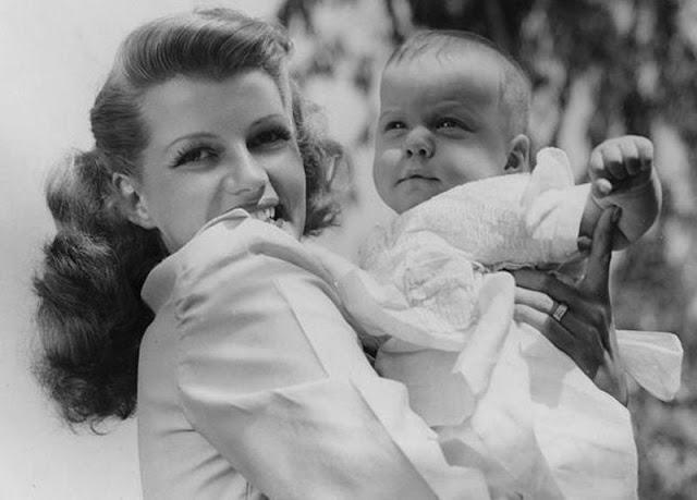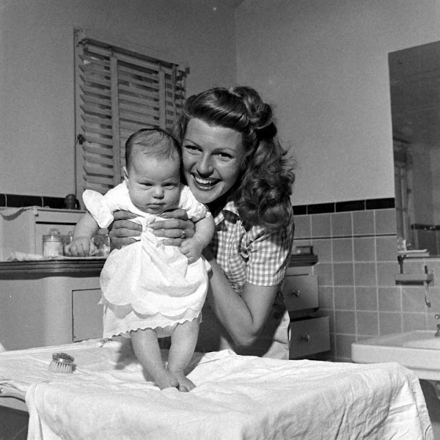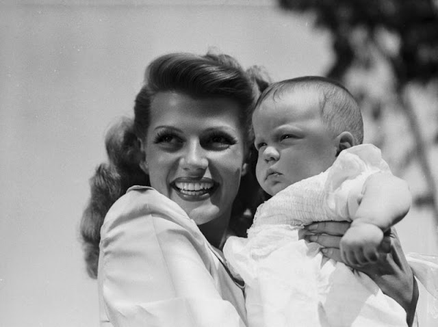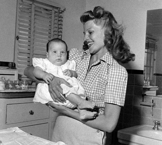 Rebecca Welles, born December 17th, 1944, gets some moral support from her beauteous mama, Rita Hayworth, as she makes her first camera appearance at home in Beverly Hills, Hollywood, CA on January 20th, 1945.