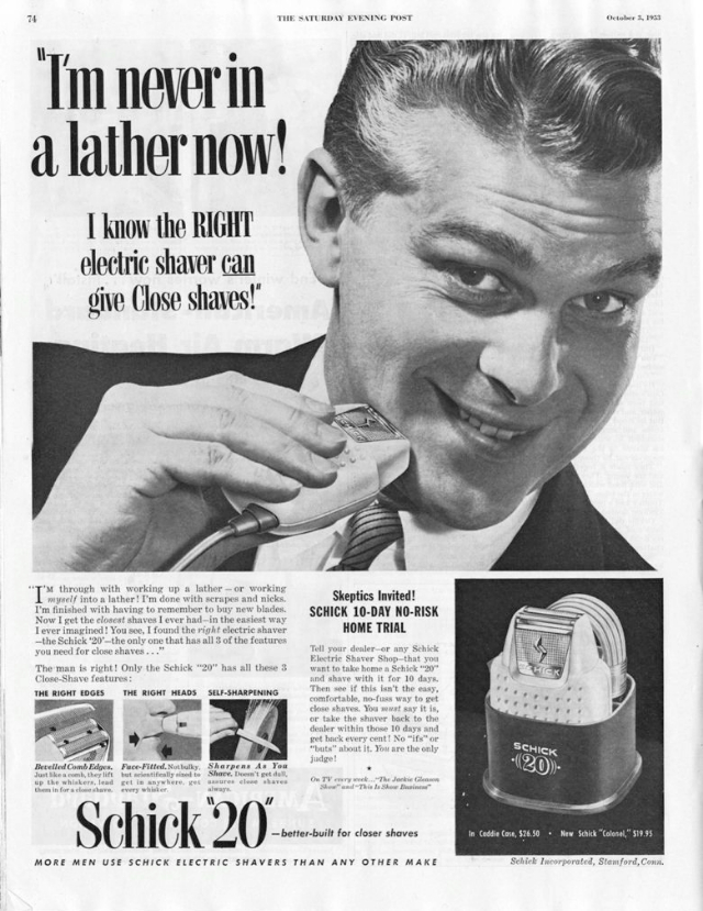 | Ad for the Schick “20” electric shaver, printed in the Saturday Evening Post, October 3, 1953. Notable as the source for Neon Park’s cover art for the Frank Zappa album Weasels Ripped My Flesh. |