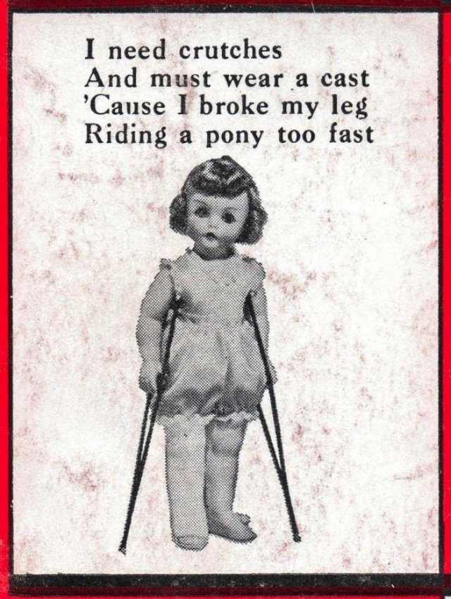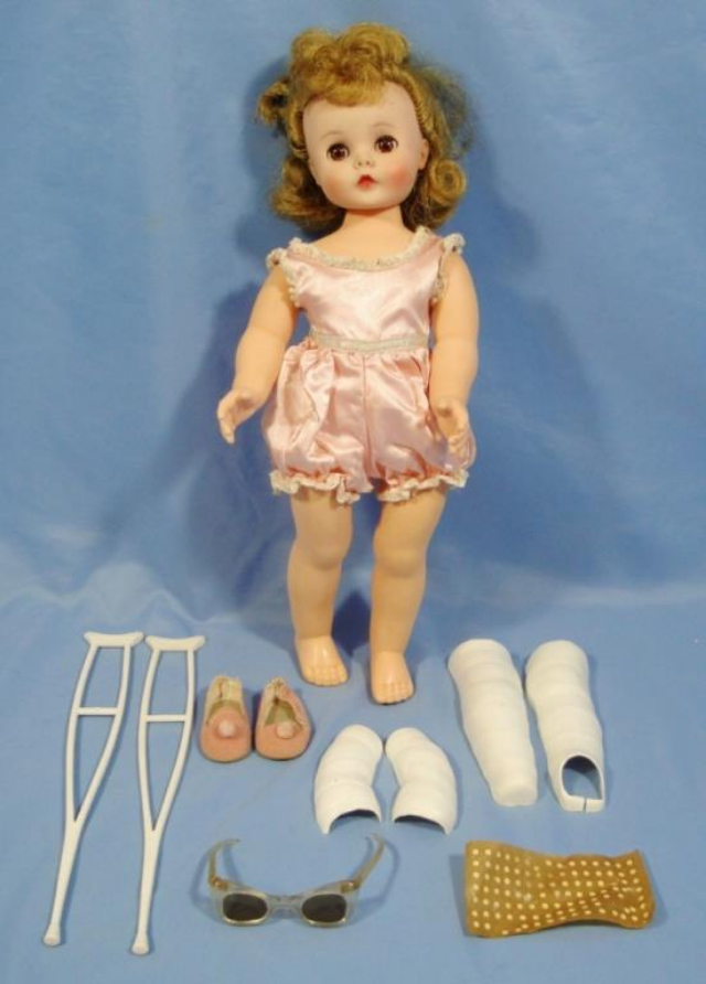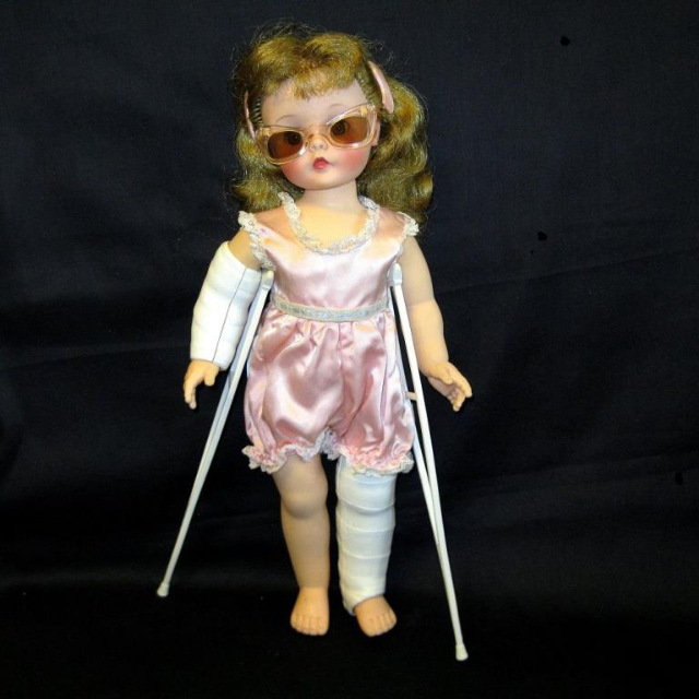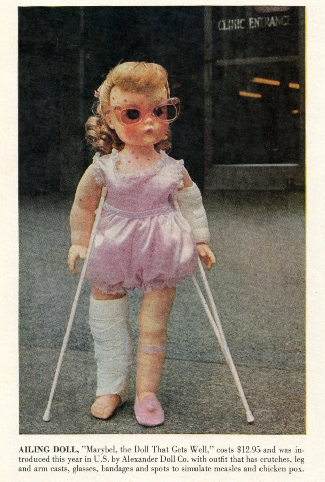 Although she had a limp, Marybel was no gimp. She stood proudly at 16 inches tall and came with an unusual endorsement for toys of the day: “Approved by leading pediatricians and psychotherapists.” Marybel’s accessories included crutches, slippers, leg and arm casts, (kinda hip) glasses, Johnson & Johnson-branded sterile scale bandages and “spots to simulate measles and chicken pox.” At the time of her release, she sold for $12.95.