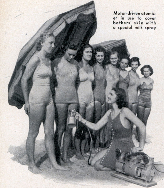 In 1938, bathers at Willow Lake, near Glendale, California, have adopted mass-production methods to speed up the process of acquiring coveted coats of sun tan. They employ a motor-driven atomizer to apply a newly developed milk spray, which was said to protect the skin from unaccustomed exposure to the sun’s rays and to help prevent burning- and peeling.