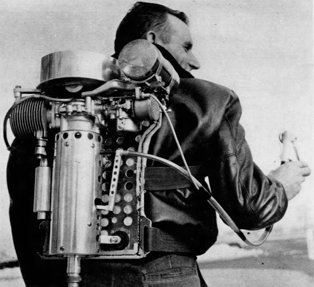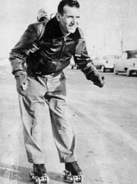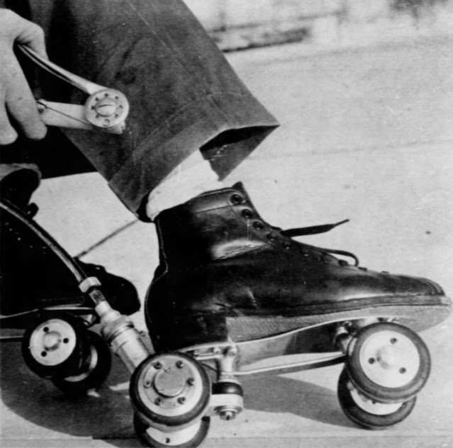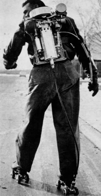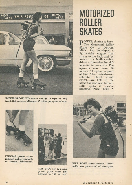 The self-propelled skates that were produced by the Motorized Roller Skate Company of Detroit, beginning in 1956. The company was founded in 1955 by an intractable inventor from Lincoln Park, Michigan, named Antonio Pirrello. Retailing for $250, that’s an astounding $2300 in today’s economy, these skates feature a 19-pound gasoline motor that is worn like a backpack. The gas connects to the right skate to push while the skater holds her left foot out in front to steer. A second cable connects to the hand-held clutch to regulate speed. Quite a lot of speed. These skates can roll at up to 40 miles per hour!