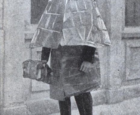 Two distinct developments were represented in a new type of rain coat recently introduced in Hollywood, 1931. The first was in the line of convenience, the coat being collapsible, so to speak, into a small compact package that can be carried in the pocket. The second was in material, paper replacing the customary rubberized fabric.