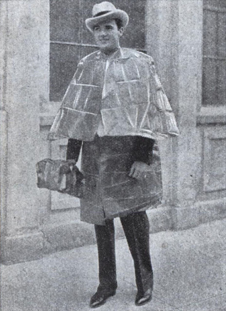When worn, the coat resembles the capes commonly worn by policemen. Special treatment of the paper prevents the coat from falling to pieces or developing leaks in a downpour. The photo shows Buddy Rogers, movie star, garbed in one of these new coats. Although it wasn’t raining, it might start any minute, and Buddy was ready.