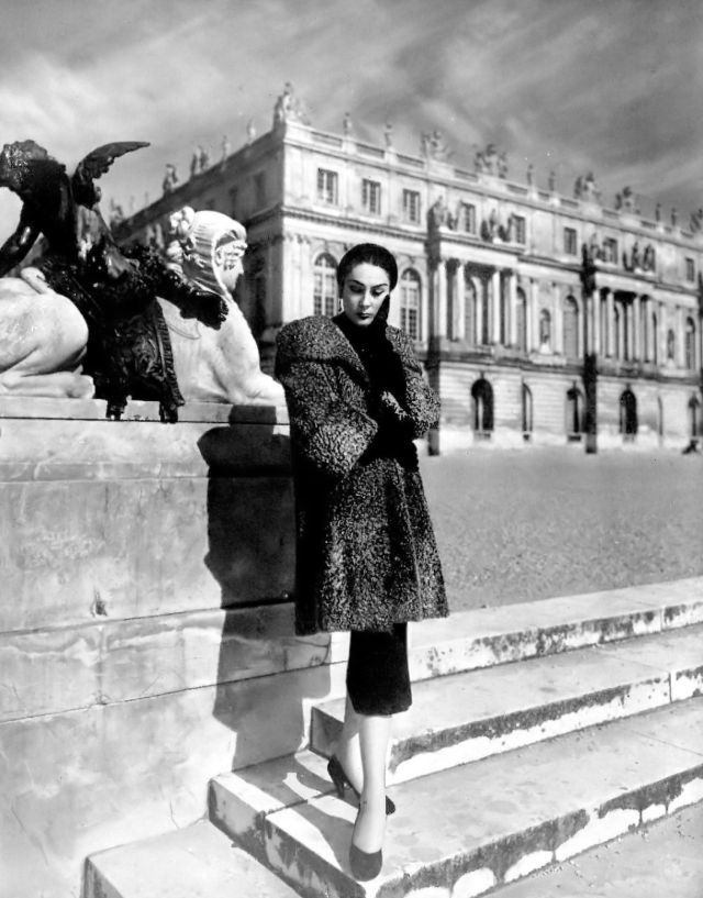 Patricia Prunonosa in a grey three-quarter astrakhan coat, featuring large cuffs and shawl collar, by Revillon, photo by Georges Saad at Versailles, 1952