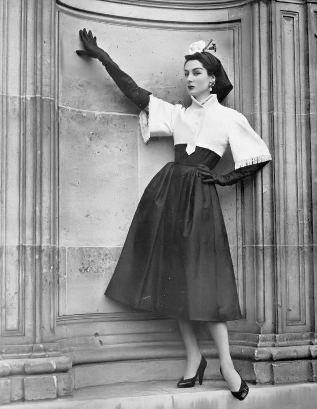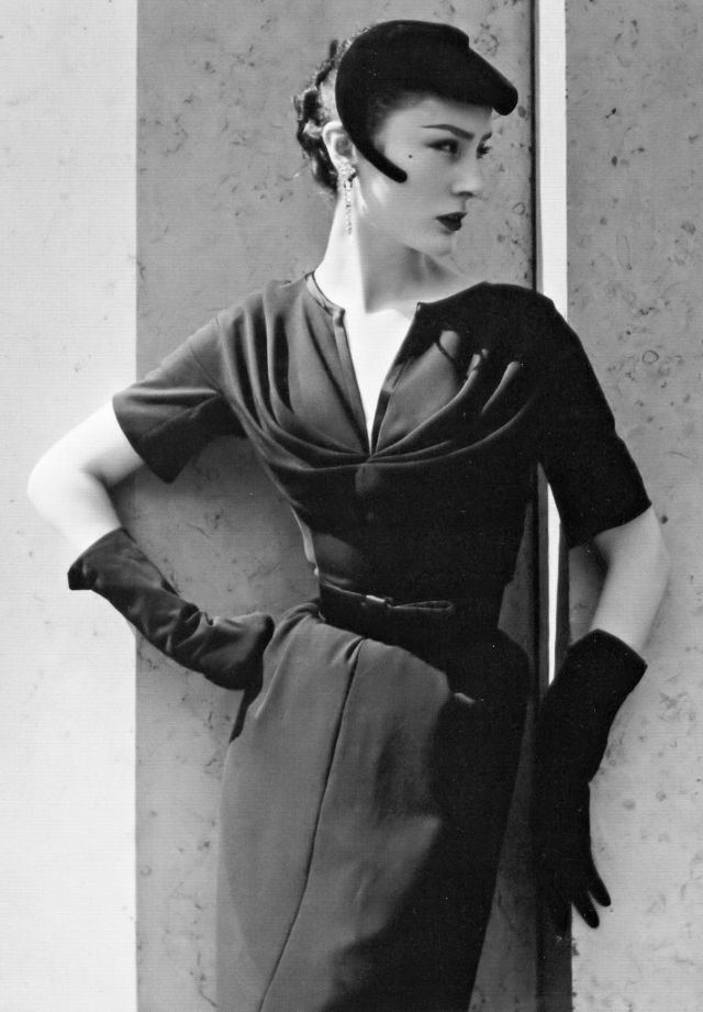 Patricia Prunonosa in a black light-weight wool dress by Jacques Fath, photo by Willy Maywald, Paris, 1953