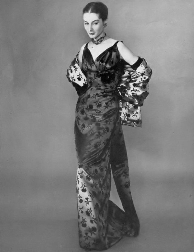 Patricia Prunonosa in anthracite satin and black cut velvet evening dress and stole by Christian Dior, photo by Georges Saad, 1953