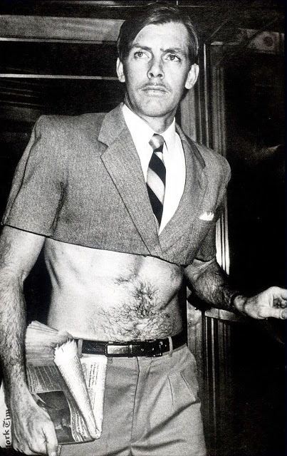 He claimed that “the ‘half-suit’ retains the crisp formality established in the neck/collar/tie /lapel area but offers an abbreviated midsection for comfort and physical.” It is the absurdity the makes the photograph work as comic.