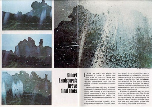 Last pictures from Robert Landsburg as the eruption of Mt St Helens beared down on him. Knowing he would die, he put his camera in his backpack and then laid himself on top of the pack in an attempt to protect its contents. His body was found 17 days later and the film was able to be developed.