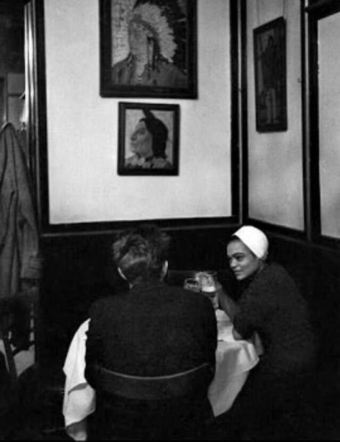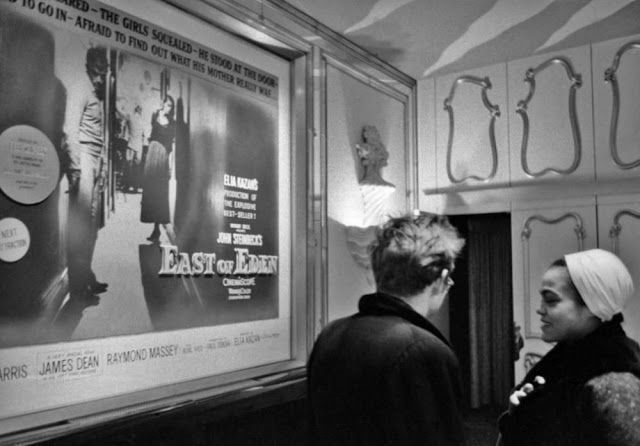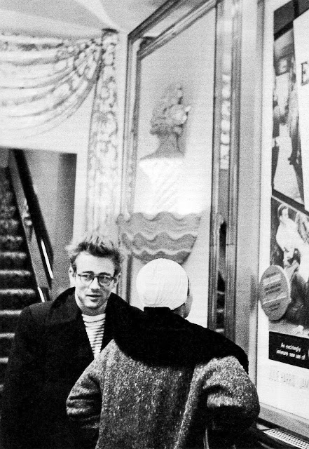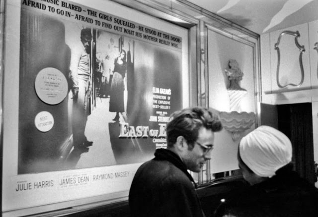 The rest of the photos are taken outside a cinema, where they are shown next to a poster advertising the screening of Dean’s first feature film East of Eden, and drinking coffee and having a cigarette in a bar.