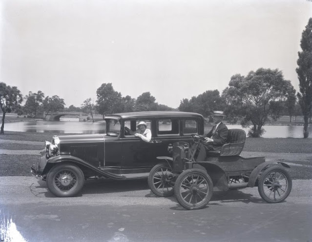 “Then and now” photo of two Oldsmobile cars. The vintage 1897 model Oldsmobile is parked next to a new 1931 Oldsmobile. Photo by Ed Meyer, June 1931