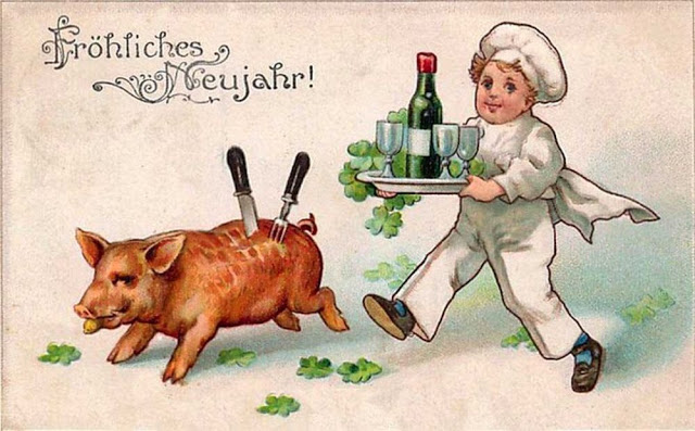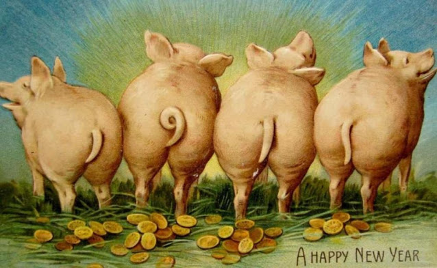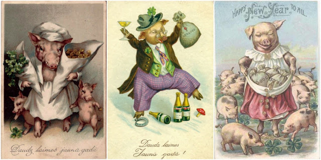 In a lot of Teutonic (old German) and Scandinavian traditions, pigs represent good luck and prosperity. That’s why you’ll see them with four leaf clovers and a lot of bags of gold or coins. The idea is basically wishing you a prosperous New Year.
