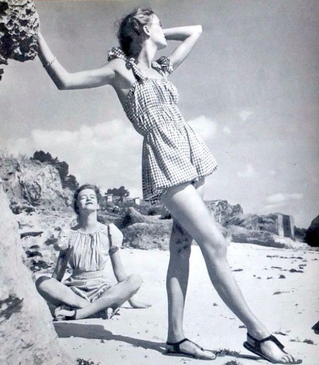 Vintage playsuits were worn outdoors – either at the beach, in the backyard to catch some sun or for sportswear. They were usually made of cotton, although they could also be found in rayon. They were brightly colored with reds, greens, yellows and blues, and were often done in patterns, checks and plaids. Floral and Hawaiian prints were popular towards the end of the decade.