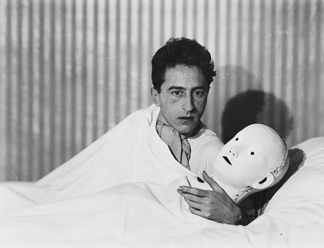 Berenice Abbott portrayed Jean Cocteau, French surrealist artist, poet, writer, and filmmaker, sitting in bed with a somewhat vacant expression, which mirrors the expression on the paper mâché doll head he cradles in his left arm. Cocteau and the paper mâché doll are covered by a white sheet and the white, neutral color of the bed linens plays off the striped wallpaper on the background wall. As a whole this image echoes the contradictory pairings of objects and humans often found in the paintings of Giorgio de Chirico and René Magritte.