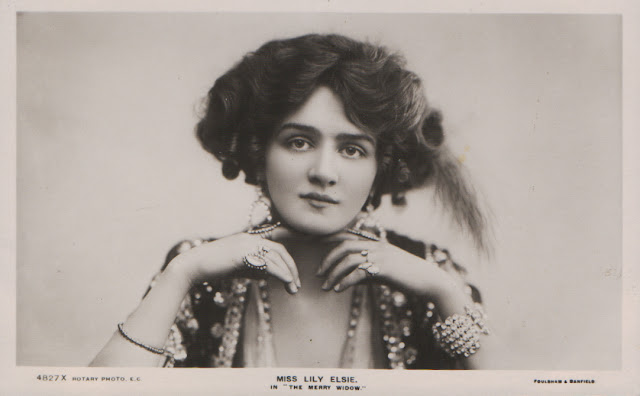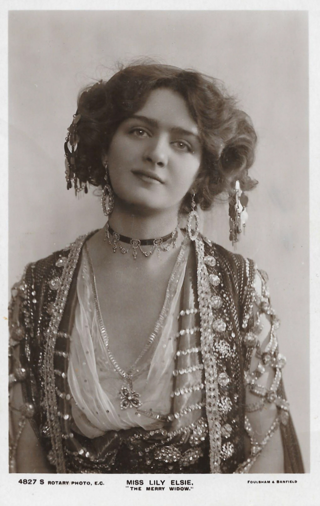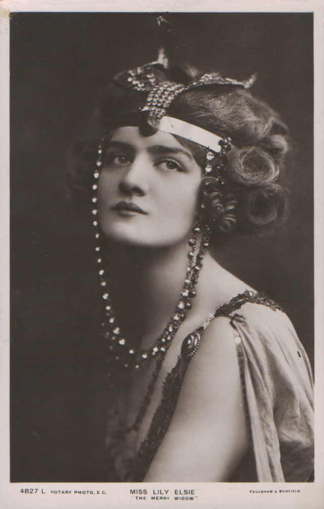 Her association with the most powerful theatre impresario of the time, George Edwardes, the father of the musical comedy genre, with his innovative and lavish productions at The Gaiety and Daly’s Theatre. Her friends included Gertie Millar, the most powerful and luminous of the “Gaiety Girls”. Elsie’s rise to fame as Sonia in Lehar’s The Merry Widow in 1907, produced by Edwardes at Daly’s Theatre, was achieved in spite of her lack of confidence and overwhelming stage fright that would leave her sick with nervous exhaustion and cause the press to accuse her of being “a part time actress” when she missed performances. Her image would endorse everything from toothpaste to face creams; the costumes and hats she wore for The Merry Widow were emulated everywhere.