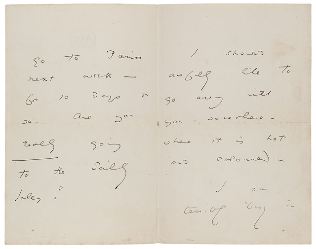 Autograph letter signed, to Bosie, ca. Nov. 1892. “go to Paris next week—for 10 days or so. Are you really going to the Scilly Isles? I should awfully like to go away with you somewhere—where it is hot and coloured— I am terribly busy in