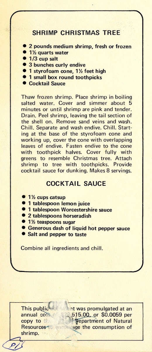 Recipe card from the Florida Department of Natural Resources for a shrimp Christmas tree and cocktail sauce. The card was distributed as a way of encouraging people to use Florida seafood products in their holiday meal planning.