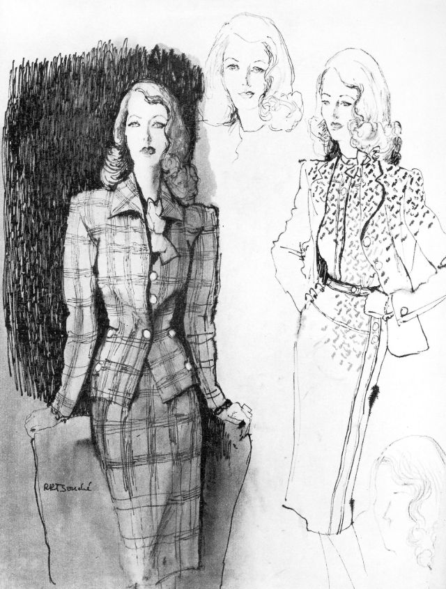 Mrs. Douglas Fairbanks (once Lady Ashley) in glen-plaid suit and a dress with matching jacket by Molyneux, illustrated by Bouché, American Vogue, June 1, 1943