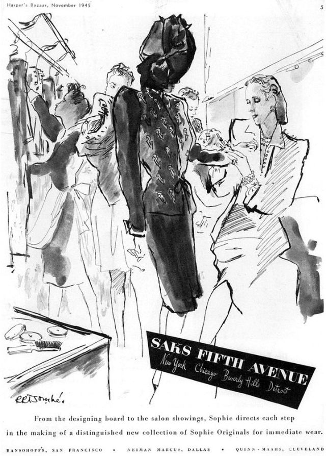 Sophie Gimbel with model wearing one of her designs, illustration by René Bouché, Harper’s Bazaar, November 1945