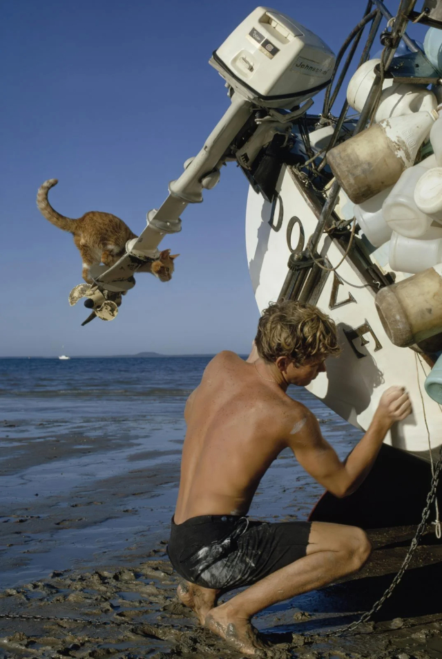 In the summer of 1965, Robin Lee Graham set sail on a journey around the world at the young age of 16. To battle the loneliness, he brought along Avanga, one of several cats that kept him company on the voyage. He later recounted “the cats frolicked in the cozy cabin, heedless of the world of water around them.”