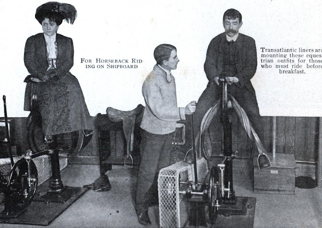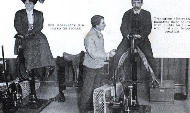 In 1915, ocean travelers who must have a horse-back ride before breakfast, were accommodated on the Cunard liner Franconia. The gymnasium of that boat was equipped with several trotters, all run by little electric motors which were adjustable to produce any gait from a canter to a wild gallop. Side saddles for ladies are provided, in addition to the regulation Western saddle with high horn, which was convenient for the rider who has had too little experience with high spirited horses.
