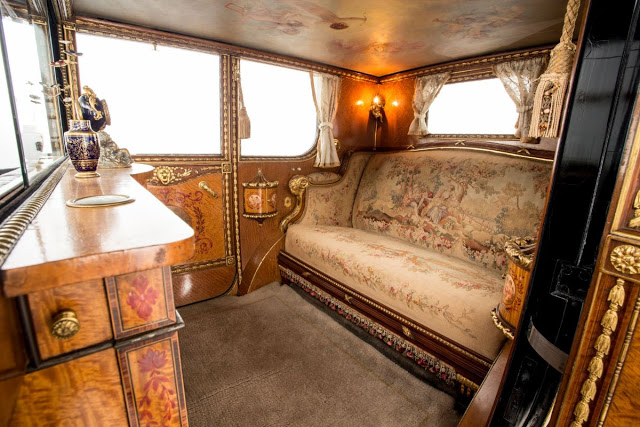 With that in mind, a sedan chair owned by Marie Antoinette was replicated as the centerpiece for the cabin—one themed to present a mobile version of Versailles.
