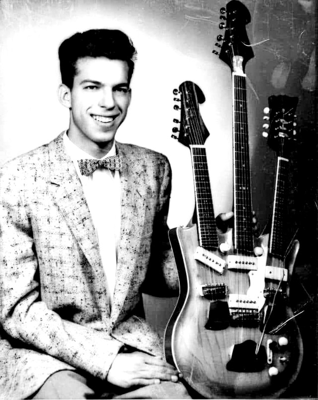 In 1954, Semie built a triple-neck guitar in his garage (the longest neck was a standard guitar, the second-longest neck an octave higher, the shortest was an eight-string mandolin.) He presented a double-neck to Joe Maphis, a Los Angeles-area TV performer of country music. He also made several similar twin-neck guitars (with the performer’s name inlaid into the neck) for Maphis’ protegé, the child prodigy guitarist Larry Collins, who still owns his three Mosrite twin-necks.