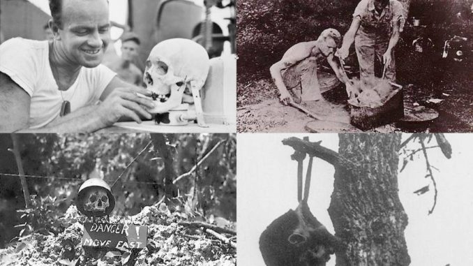 Wikimedia CommonsClockwise from top left: U.S. soldier with the Japanese skull adopted as the “mascot” of Navy Motor Torpedo Boat 341 circa April 1944, U.S. soldiers boiling a Japanese skull for preservation purposes circa 1944, a Japanese soldier’s severed head hangs from a tree in Burma circa 1945, a skull adorns a sign at Peleliu in October 1944.