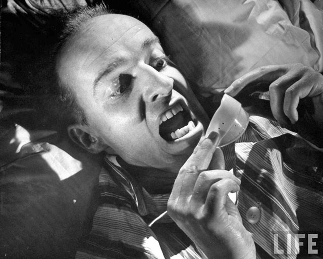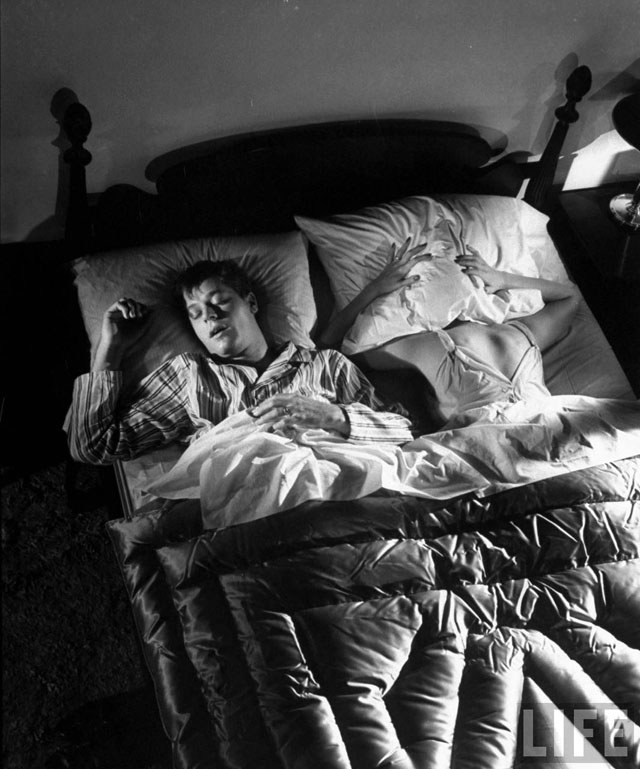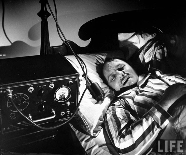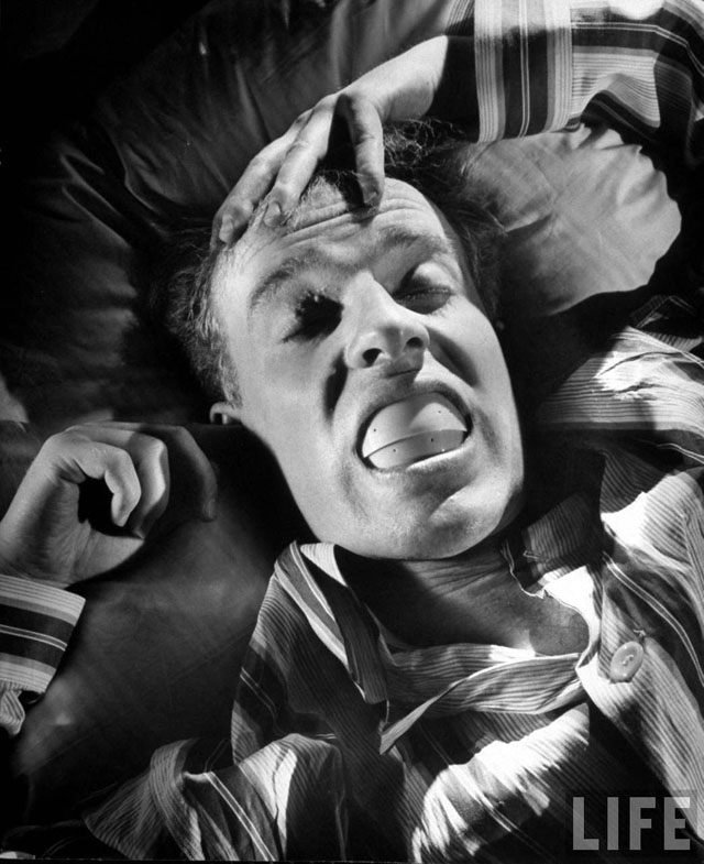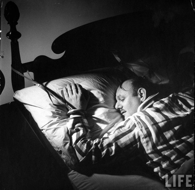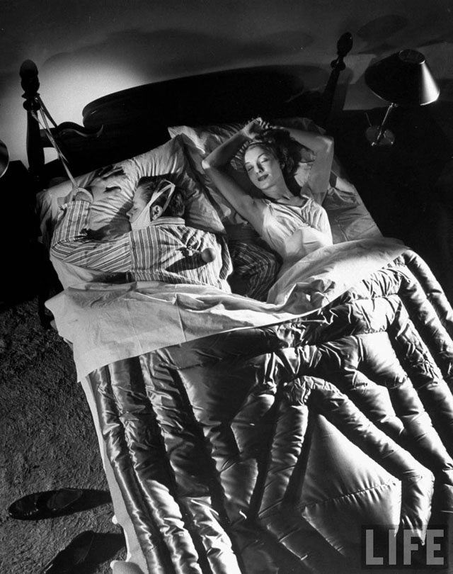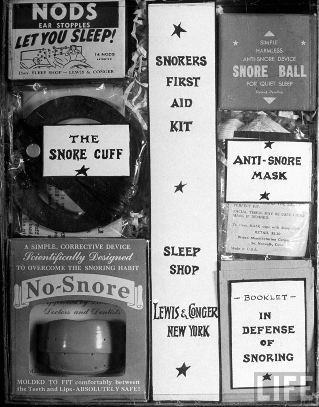 Here are some fun pictures from a LIFE magazine article called “Snore Stoppers,” from their February 28, 1949 issue. As you might have guessed by now, it focused on a variety of gadgets and tools designed to stop snoring, one of mankind’s great remaining scourges.