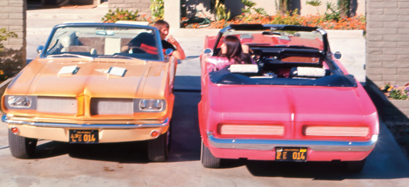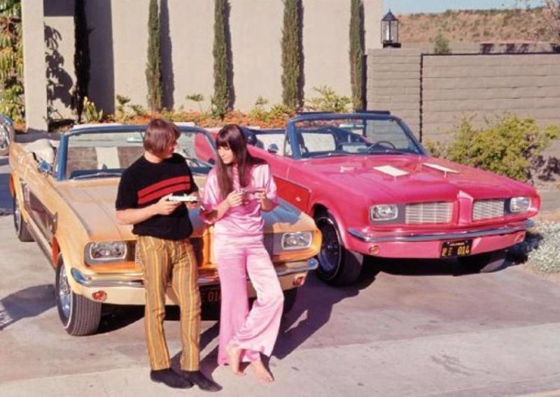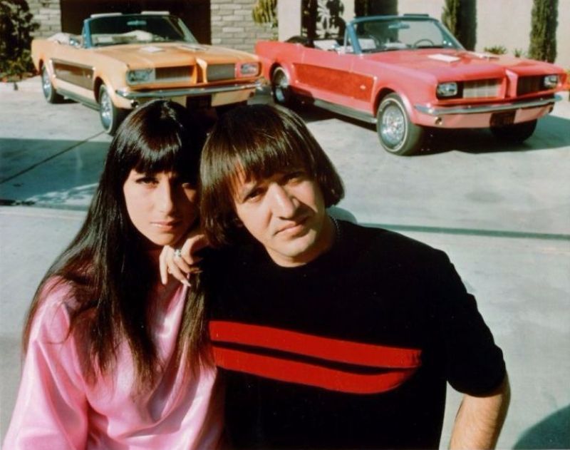 Sonny and Cher with their his-and-her Mustang convertibles, 1966