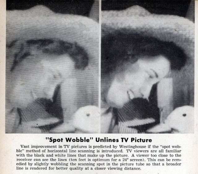 Vast improvement in TV pictures is predicted by Westinghouse if the “spot wobble” method of horizontal line scanning is introduced. TV viewers are all familiar with the black and white lines that make up the picture. A viewer too close to the receiver can see the lines (ten feet is optimum for a 24″ screen). This can be remedied by slightly wobbling the scanning spot in the picture tube so that a broader line is rendered for better quality at a closer viewing distance.
