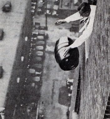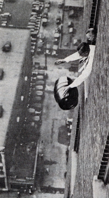 Here it was dropped from a window, plunging more than 200 feet to a hard-packed gravel parking space at the rear of the building. The barrel is said to have survived the shock without springing a leak, although the side was badly dented.