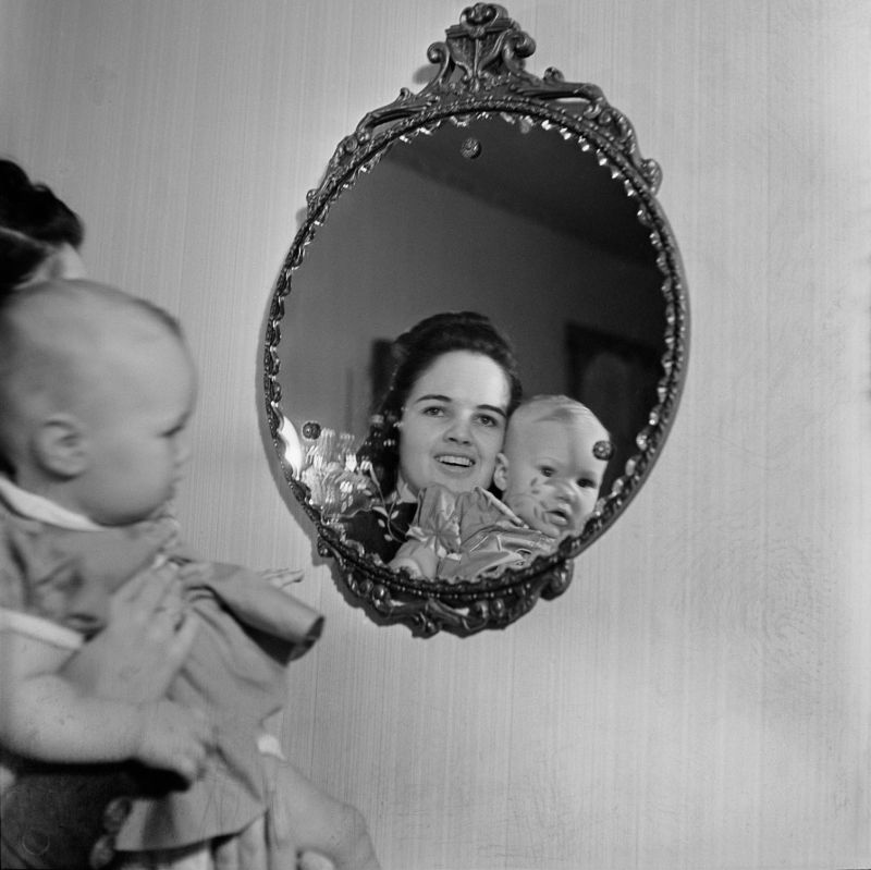 An unidentified woman holding an unidentified infant girl in front of a mirror