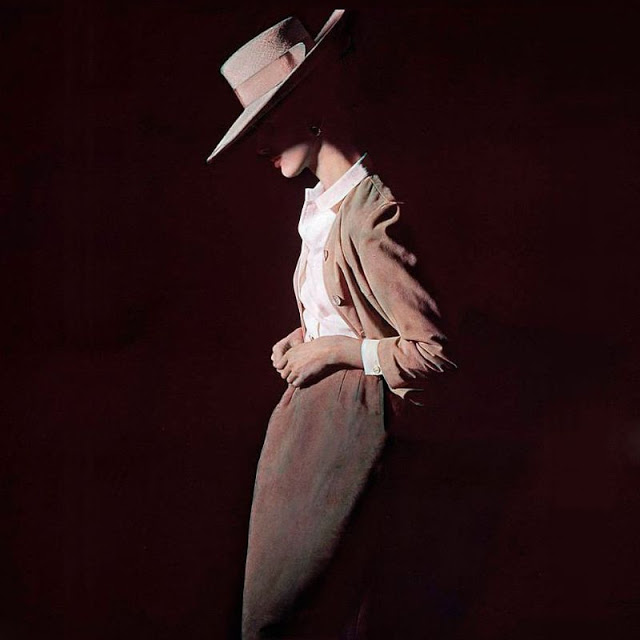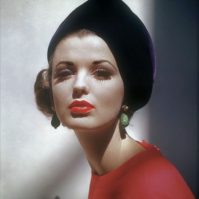 | Dorothy McGowan wearing a purple velvet toque with faux jade drop earrings by Marvella, 1961 |