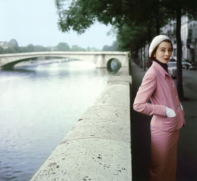 Bettina Graziani, photo by Lionel Kazan, quai de Béthune, Paris, Elle, July 1954