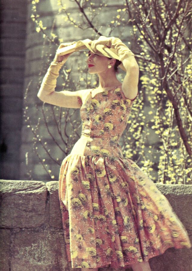 Bettina poses in an embroidered dress by Lempereur, photo by Lionel Kazan, Elle, May 30, 1955