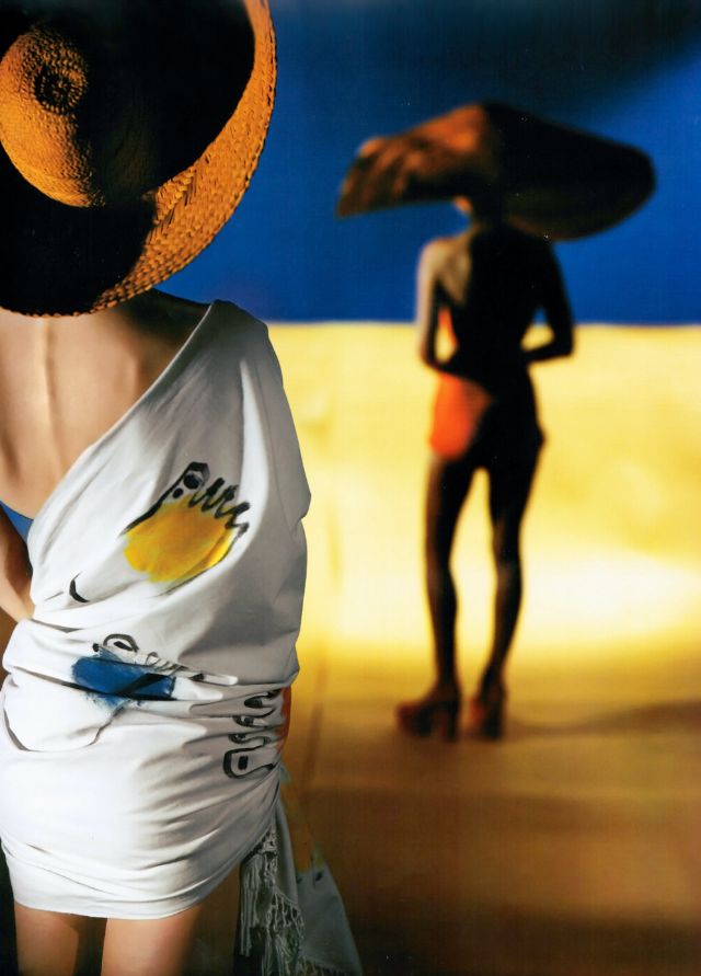 Model is wearing fisherman blue beach-suit with green belt by Carolyn Schnurer, photo by Serge Balkin, 1945