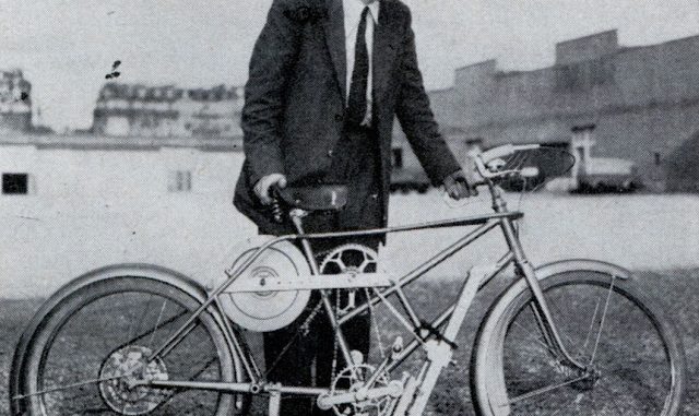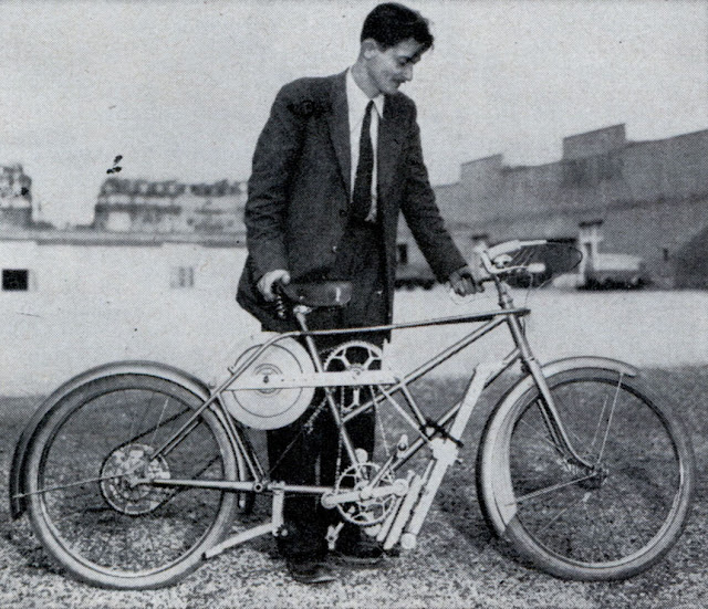 There’s a weird assortment of sprockets and chains incorporated into a supergeared bicycle invented in France in 1954. The chains appear to run at random all over the framework of the bicycle, but the arrangement gives the rider a choice of several gears. The bicycle has two-wheel brakes.
