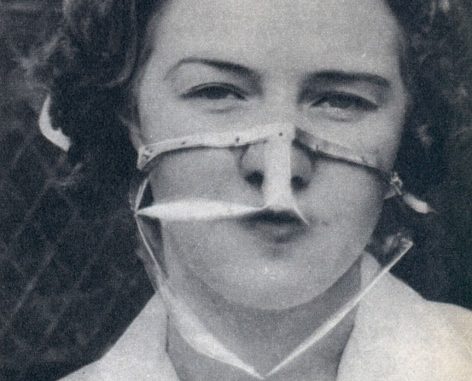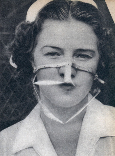 Invented by a well known doctor in 1938, a new type of surgical mask is constructed from transparent material and, due to its flexible metal frame, can be instantly adjusted to fit the contour of the face.