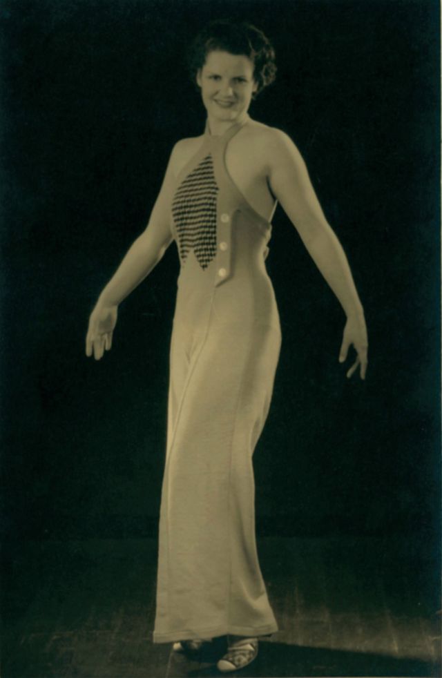 Bathing suits in the early 1930s changed little from the 1920s styles. Some now had striped tops like men’s swimwear had and others had much lower backs. Appliques of sea-life, anchors, and birds gave simple swimsuits some charm.