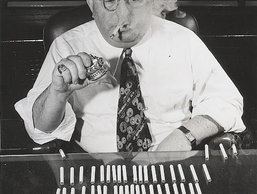 Testing cigarettes was part of Sol C. Korn’s job as the director of various cigarette and cigar company’s from the 1920s until the 1960s. In 1945 when this picture was taken he was president of the Fleming-Hall Tobacco Company.