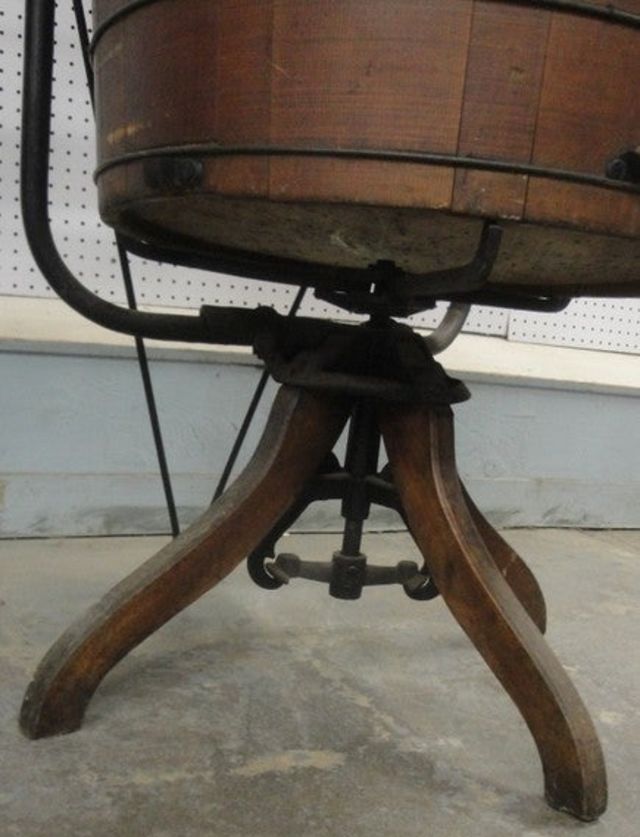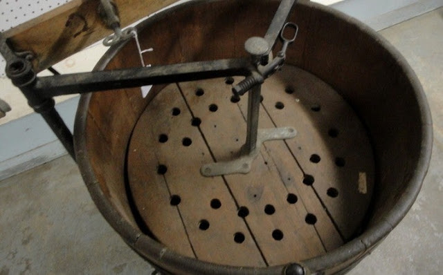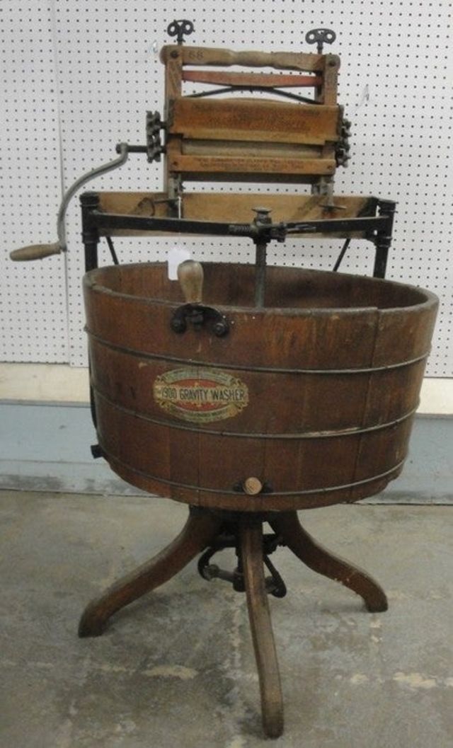 In its day, the Gravity Washer was considered a labor-saving device! The very simple but effective mechanism found under the drum provided a back and forth, oscillating motion while at the same time causing the drum to move vertically up and down. The source of power was typically the woman of the house. The operator would sit beside the machine and, using the handle on the side of the drum, would rotate the drum back and forth. If you were to examine the movement of the water as it circulated through the clothes in the tub, you would see little difference when compared with a modern day machine.