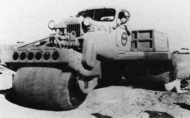 William Albee returned to California, and in 1951, began working on a modern adaption of the Eskimo bags. He designed bag-like tires made from nylon impregnated with rubber, that were very flexible. They deformed easily but did not expand. After many consultations, the Goodyear Tire and Rubber Company agreed to manufacture them according to plans designed by Albee. Eventually, Albee founded the “Albee Rolligon Company” and began producing vehicles fitted with low pressure tires. Later, with the help of the U.S. Army, Albee’s company released a Jeep, a Reo truck and a Dodge Power Wagon, all equipped with Rolligons. The final creation was a 7-ton off-highway transporter, the “Albee Rolligon.”