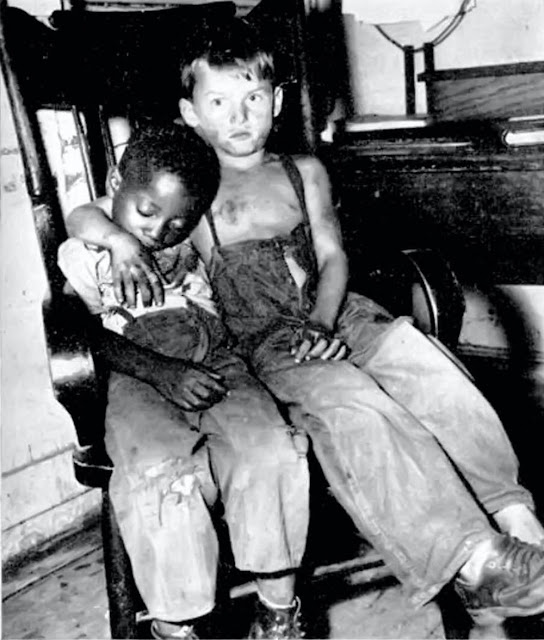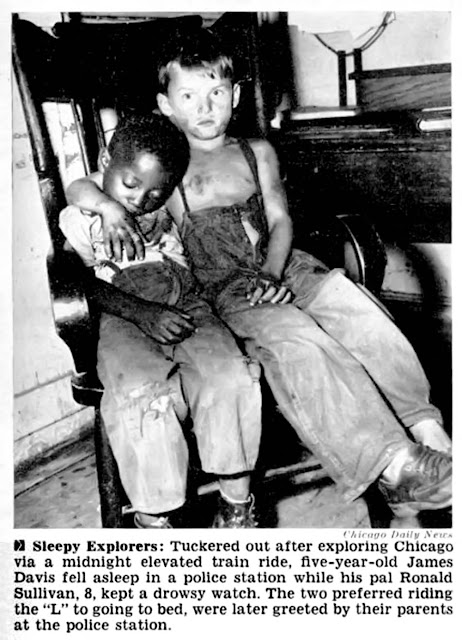 | James Davis, 5, fell asleep at a Chicago Police Station while his good friend, Ronald Sullivan, 8, keeps watch in August 1952. |