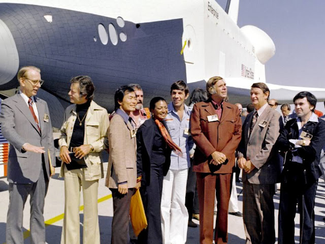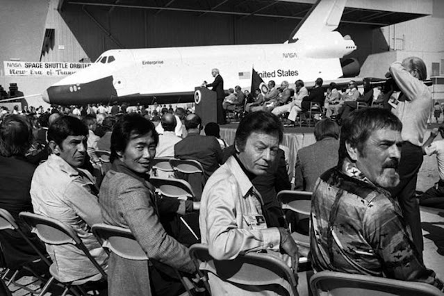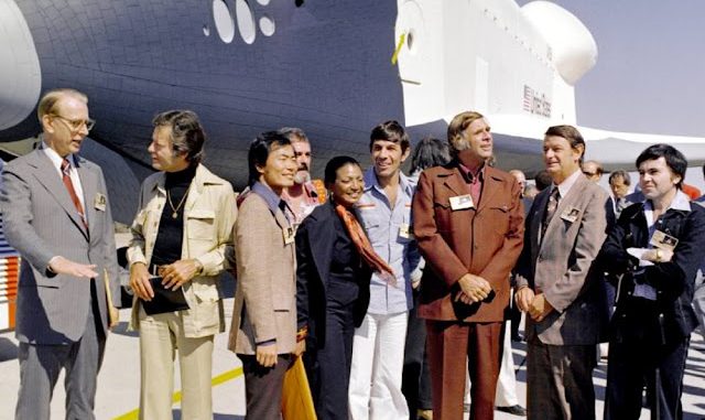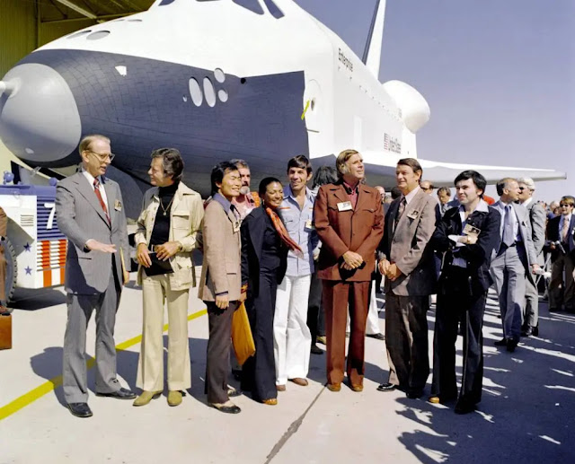 As Enterprise emerged from the hangar, the Air Force Band of the Golden West from March Air Force Base in Riverside County, California, played Alexander Courage’s Star Trek musical score. Several Star Trek cast members as well as the show’s creator Gene Roddenberry were on hand to witness the historic event, as were the four astronauts who were scheduled to conduct the approach and landing tests with Enterprise – Fred W. Haise, C. Gordon Fullerton, Joe H. Engle, and Richard H. Truly.